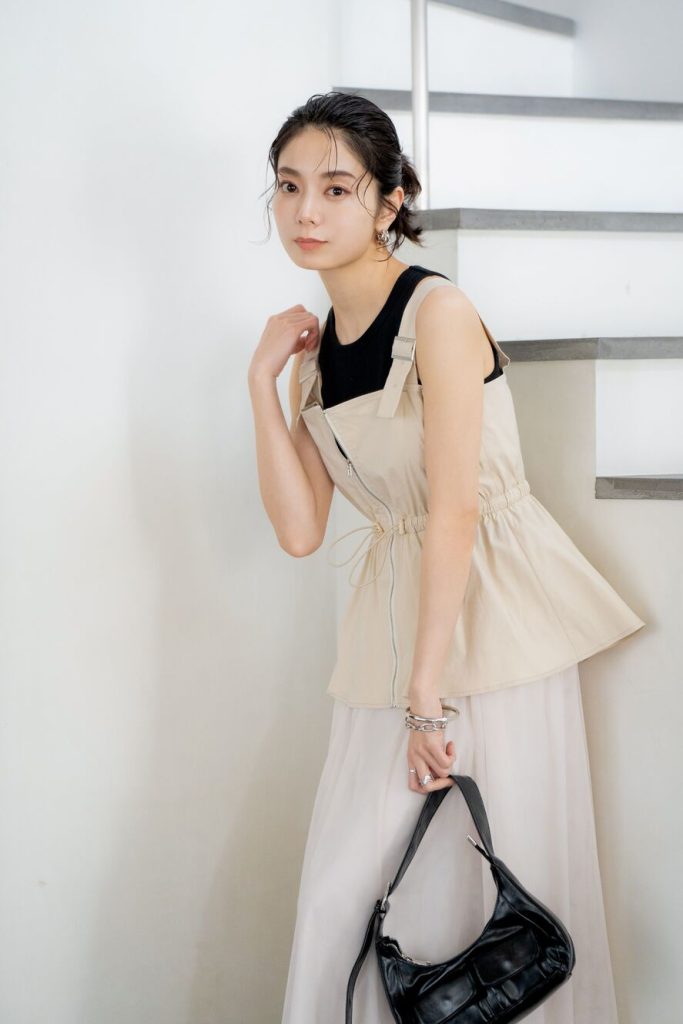 公式サイト限定で、1枚で華やかな表情を叶えるサマーニットが登場。ノースリーブのポエプラムシルエットでくびれを引き立たせて、スタイルアップを狙えます。軽やかな素材感で夏らしく。