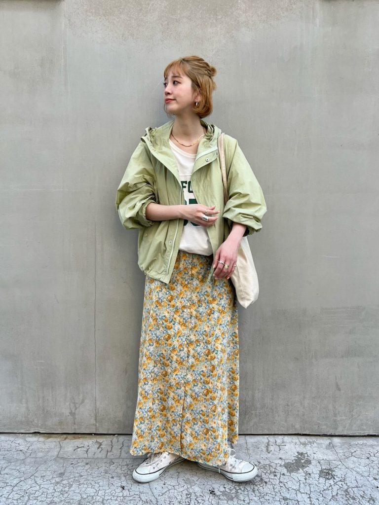 きゅんとくるピスタチオカラーのマウンテンパーカーには大胆な柄物を合わせるが◎。全体をイエローベースに揃えることで、派手すぎず春らしさを詰め込んだ愛らしいコーデに。