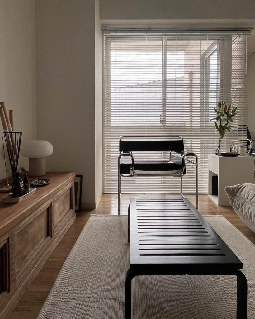 モダンでスタイリッシュな印象のデザイナーズ家具と、古家具が同居するリビング。