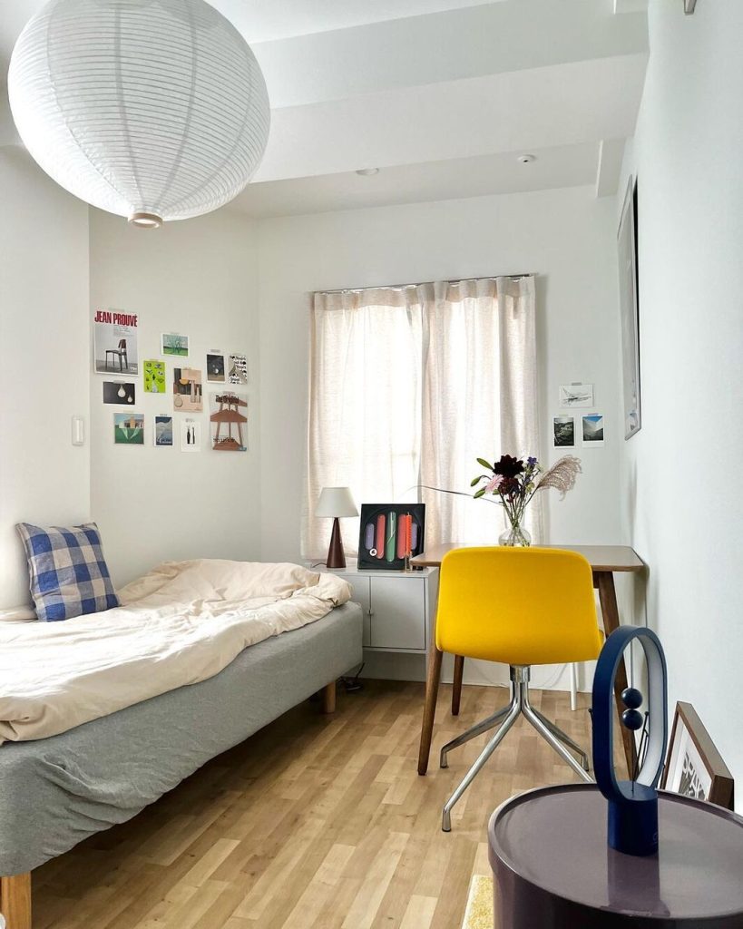お部屋の広さは6畳ほど。ベッドリネンやカーテンは無印良品で揃えシンプルにまとめながらも、イエローやブルーなどのアクセントカラーを上手に取り入れていらっしゃいます。