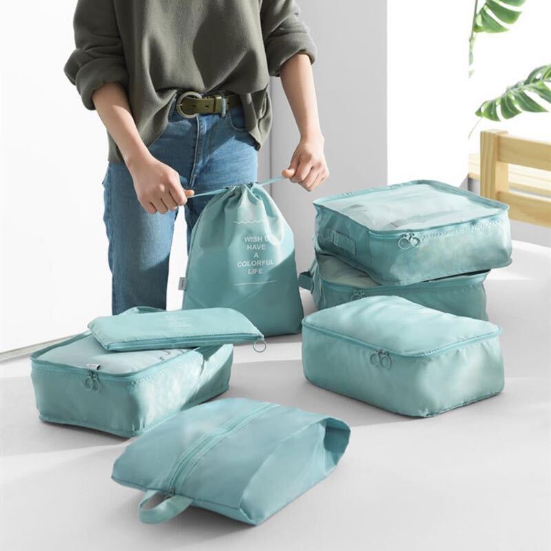 夏の長期休みで旅行や帰省を考えている人もいるでしょう。トランクケースの中身がごちゃつかないよう、トラベルポーチのセットがあると便利です。衣類から洗面用具、靴、洗濯物袋などが入った全8点。