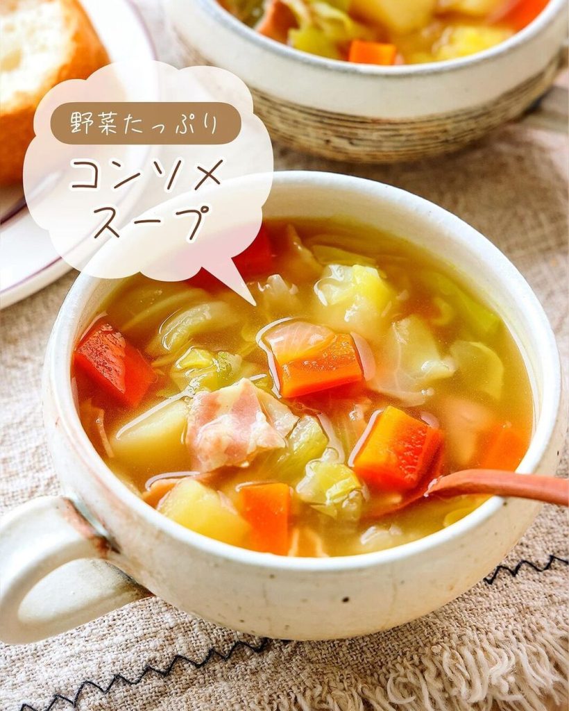 野菜をたくさん入れることで、栄養をしっかり摂れて、うまみもぎゅっと凝縮されたコンソメスープ。切って煮込むだけで簡単に作れます。お好みの野菜を加えても◎。