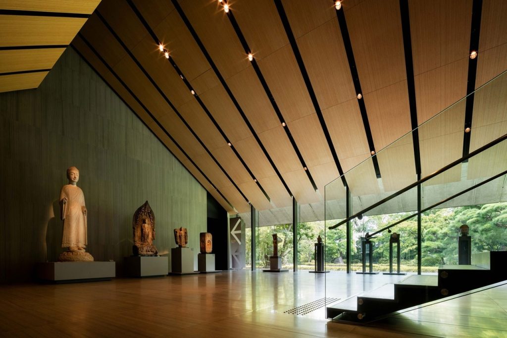 地上2階・地下1階建ての和風家屋を思わせる大屋根が印象的で、本館は世界的な建築家・隈研吾(クマケンゴ)の設計によるもの。趣の異なる6つのギャラリーで、絵画や書蹟、青銅器、茶の湯の美術など、多岐にわたる所蔵品を魅力的に紹介しています。