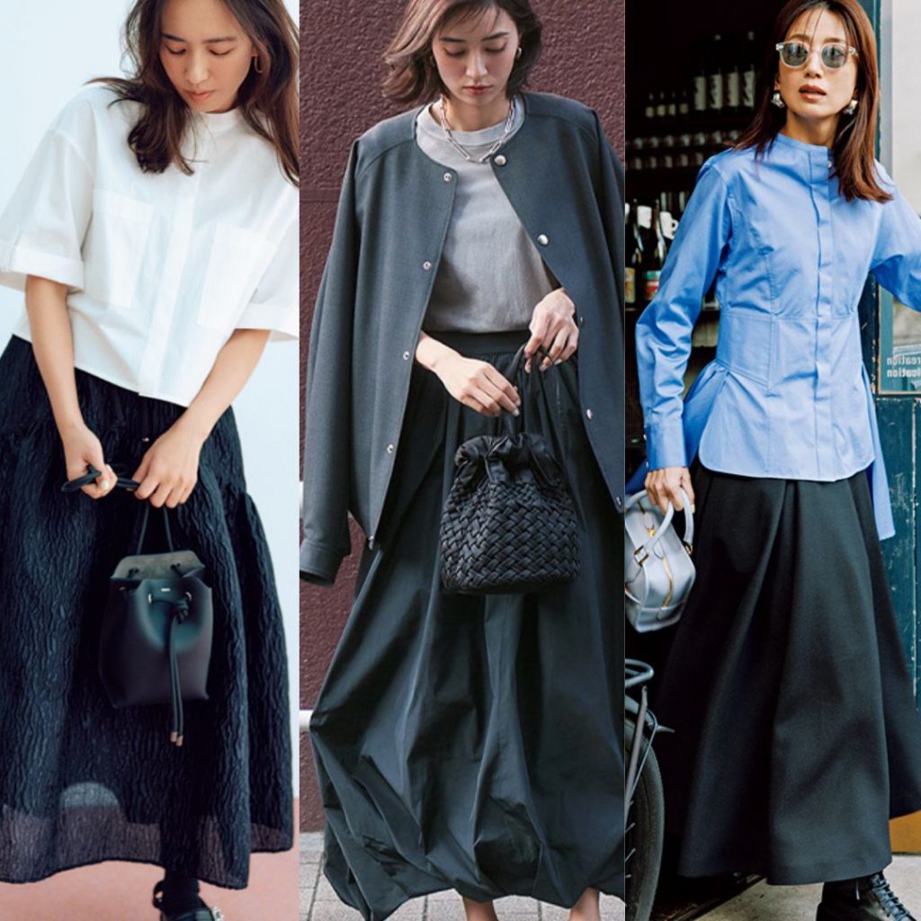 から、季節や気分に合ったスタイルをまとめてお届けしています。今週は「黒スカート」をピックアップ。気分が下がりがちな雨の日こそオシャレで気分UP!雨の跳ね返りが気にならない黒スカートに頼れば、今どきコーデも簡単に。7選まとめてご紹介します。