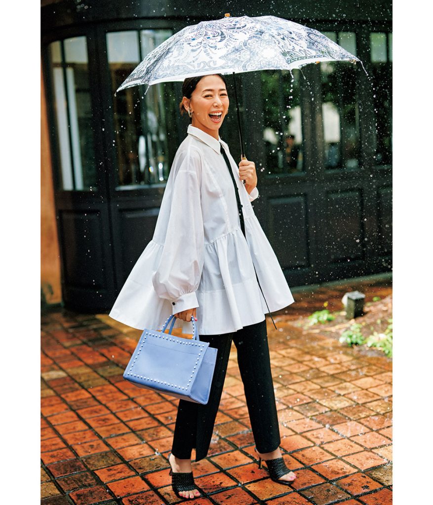 ワイドパンツ〈吸水速乾/UVカット〉¥11,000(プラステ)ニット¥19,800(ユナイテッドアローズ/ユナイテッドアローズ 六本木ヒルズ店)バッグ¥170,500(J&M デヴィッドソン/J&M デヴィッドソン カスタマーセンター)パンプス¥9,990(ステッピ/アンフィーロ〈オンワード樫山〉)傘¥12,100(トラディショナル ウェザーウェア/トラディショナル ウェザーウェア ルミネ有楽町店)ピアス¥8,800(ツル バイ マリコ オイカワ)エタニティリング¥25,200(アビステ)リング¥118,800(プライマル)ブレスレット¥143,000(ガルニ/ガルニトウキョウ)