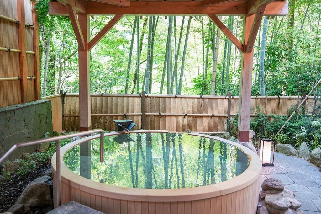 一番人気の貸切風呂はインフィニティスタイルの「川音(かわと)の湯」。唯一の完全露天風呂で、箱根の大自然に溶け込むように温泉を楽しめます。湯船は深さ1.1mの立ち湯と座れるエリアがあり、まるでプールのようなたっぷりのお湯に包まれる感覚が最高……! 時には目の前の青もみじに野鳥が遊びに来て、「ピピピー」と鳴きながら私を癒やしてくれました。