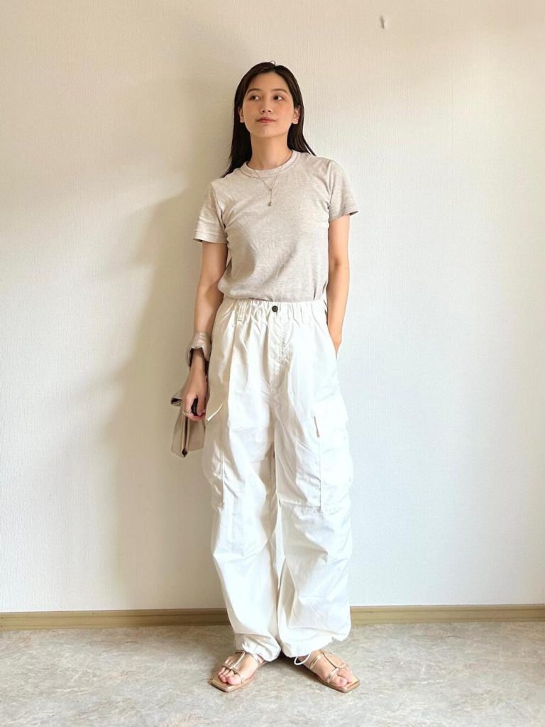 着るだけで美シルエットを叶えてくれる、ユニクロユーの半袖Tシャツ。肌触りがよく、着心地もいいです。白Tは着回せること間違いなし。グレーのワイドパンツを合わせると、大人っぽい表情のきれいめカジュアルの完成です。