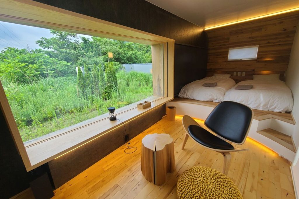 宿泊する8番A棟の扉を開けて広がるのは、大きな窓から光が差し込む、ナチュラルな空間にツインのベッドが設置された客室。