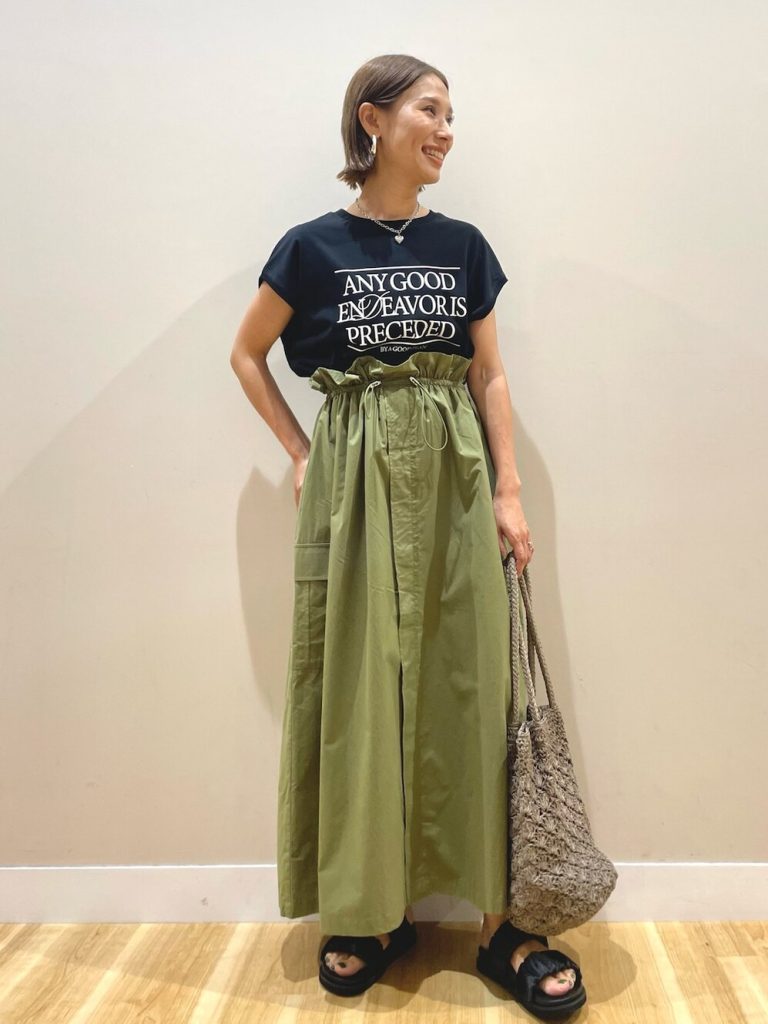 王道のカーキカーゴスカートとなら、今っぽいシルバーメタリックTがベストマッチ。フロントだけインすれば、サイドのポケットの膨らみも気になりません。Tシャツは少し大きめでラフな方がより今っぽくなります。