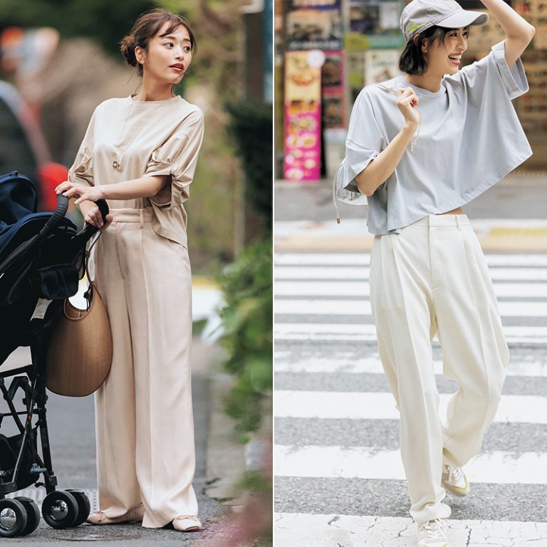 最旬のトレンドでもあるピンク。カジュアルな日こそ、鮮度の高い色でコーデに遊び心を加えるのもおすすめです。フレンチスリーブで逆三角形のようなシルエットのため、タイトなカーゴスカートがフィットします。