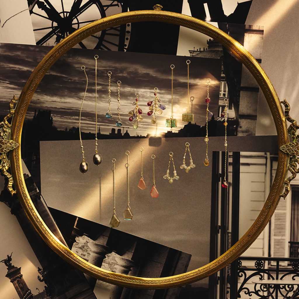 パリの夕暮れや美術館の絵画、ムーラン・ルージュでみたカラーたち。まるで旅行している気分になれるバリエーション豊富なカラーストーンを、パリの石畳の街角にもピッタリなデザインに落とし込んだピアスです。