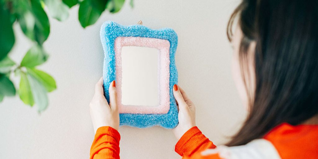 「ブルー×ピンク」と「うねうねした形」が大好きなので、その組み合わせがたまらなくかわいいです。アート作品のようで、狙い通りお部屋の主役になってくれました。タフティングならではのもこもことした立体感も楽しめるので、ついつい触ってしまいます。壁掛け用にループが付いていたり、鏡部分も広くなっていたりと、実用性が高いのも嬉しいポイントです。