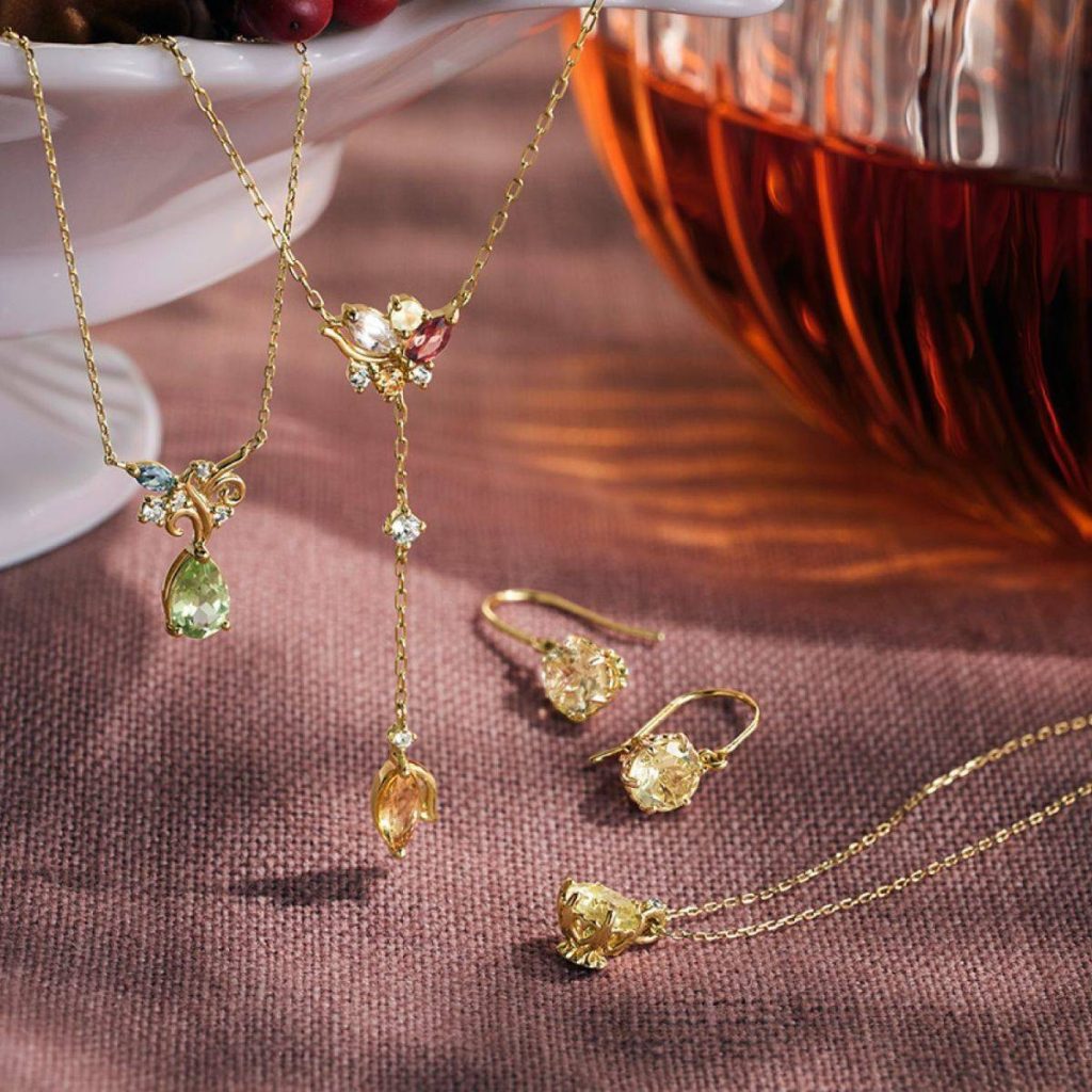 お茶会で使用する装飾たっぷりのティーカップをモチーフに、爽やかなレモンクォーツが組み合わさったデザインや、広がる湯気と香りが滑らかな地金のカーブで表現された、ペリドットのカラーが鮮やかなデザインも登場します。
