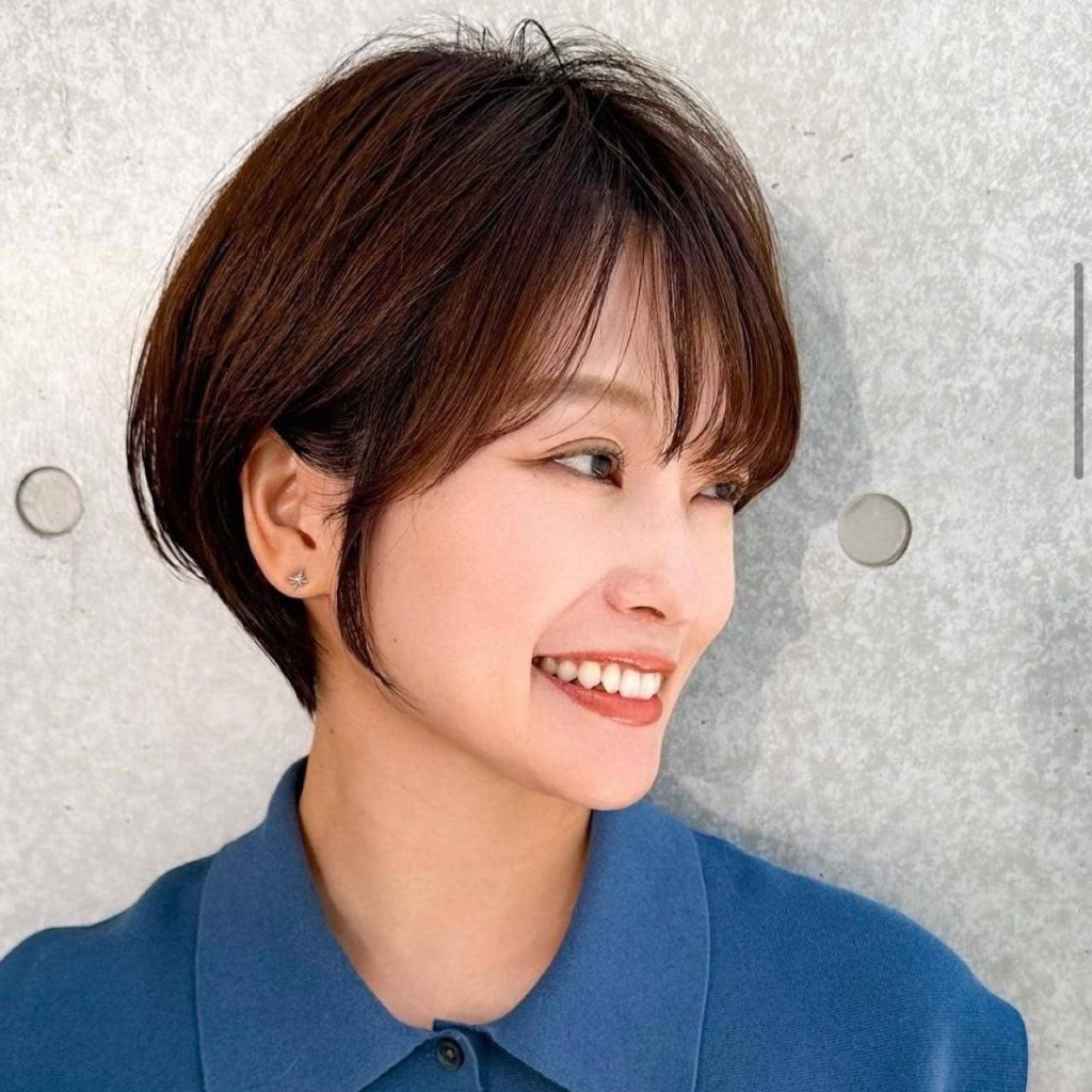 全体のシルエットをコンパクトに見せたいなら暗めトーンの透明感のあるヘアカラーをチョイス。額を覗かせて顔幅を細く見せることで、より目元印象が引き立ち大人っぽい雰囲気を醸せます。なお、肌をより白く見せたいなら、ブラウン系やベージュ系の色味がおすすめです。