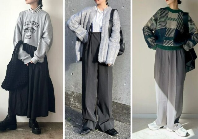 モノクロよりも柔らかな印象になるグレーは、オシャレを格上げしてくれるアイテム。ワントーンコーデに仕上げるなら、上下で質感を変えるのが正解です。さりげない胸元のブランドロゴが、シンプルになりすぎないポイント。