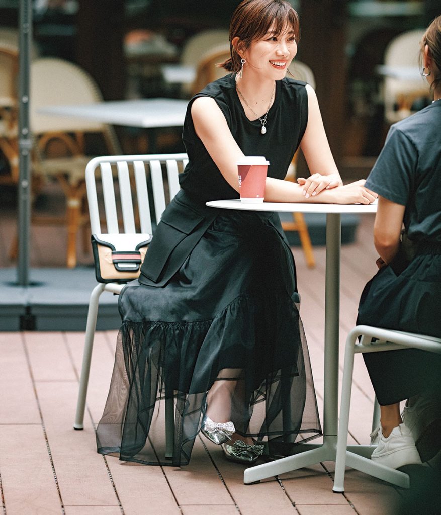 キャミソールブラウス×カットソー[セット販売]¥20,900(Stola.)ジレ¥31,900(サクラ/インターリブ)ワークベルト付きチュールスカート¥30,800(ジャスグリッティー)バッグ¥152,900(ピエール アルディ/ピエール アルディ 東京)パンプス¥36,300(PIPPICHIC/ベイジュ)ピアス¥3,960〈プチタミ〉バングル¥3,900〈soie〉(ともにロードス)