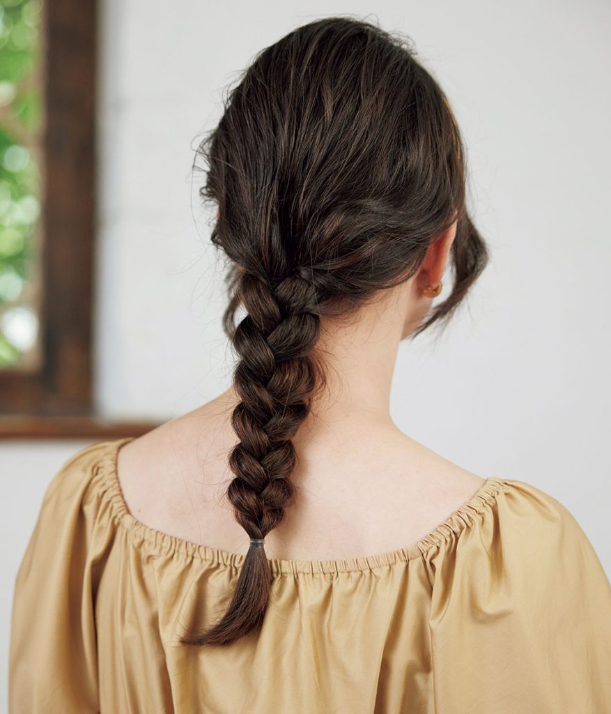 全体を巻き、根元をくしゃっと揉んでスプレーをし、後頭部に手ぐし感を出します。途中まで後ろで三つ編みをし、肩下からサイドで編みます。三つ編みを縦横に引っ張り、横長を意識して太めに崩します。根元は横太がポイント。顔周りのおくれ毛で動きを足し完成。