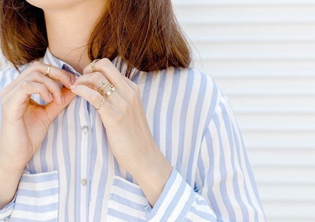 色に染まらない白のフレアスカートだからこそ、単調見えは気になるところ。それならメンズライクなストライプシャツとのコーデに挑戦。