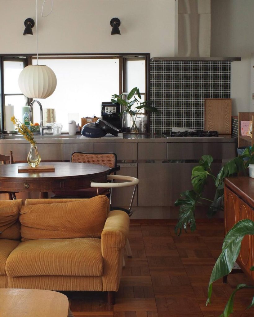 ミッドセンチュリーテイストの家具や、古道具などを取り入れた、おしゃれなリビングダイニング。