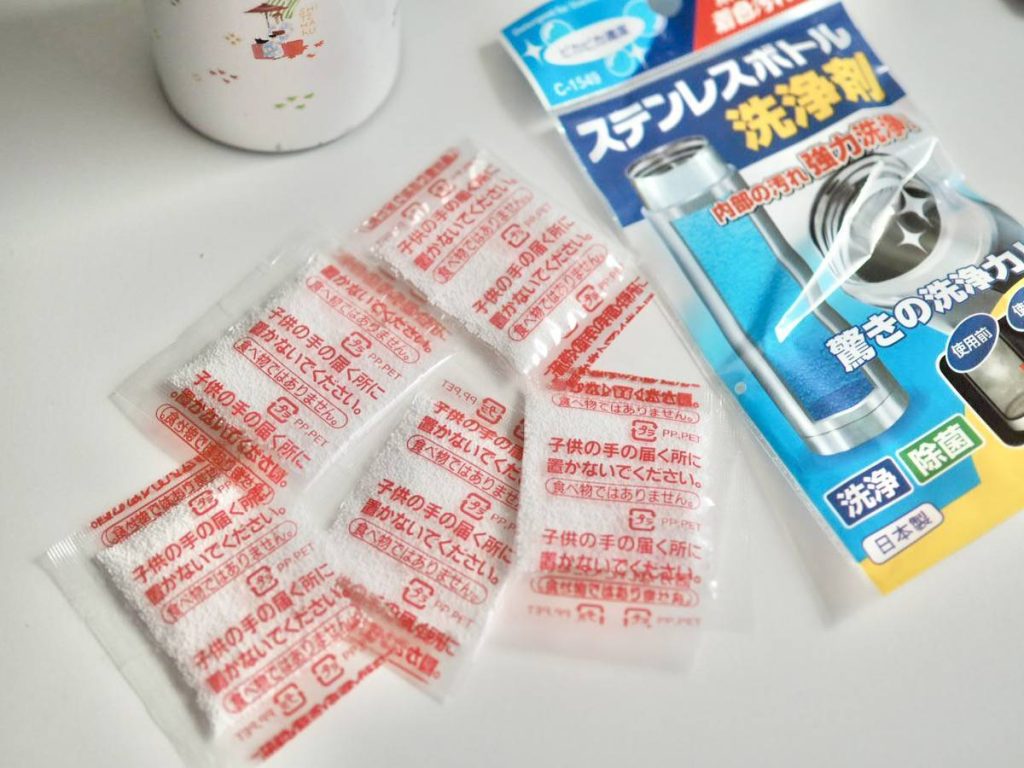まずはステンレスボトルに洗浄剤を1包入れましょう。1包で800mlまでの水量に対応しています。