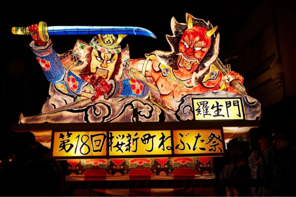 青森市の本場のねぶたを桜新町で楽しめる「桜新町ねぶたまつり」。ねぶたの運行では、壮大なねぶたが夜空を彩り、迫力満点のパフォーマンスを鑑賞できるほか、桜新町だけのサザエさんねぶたも登場します。