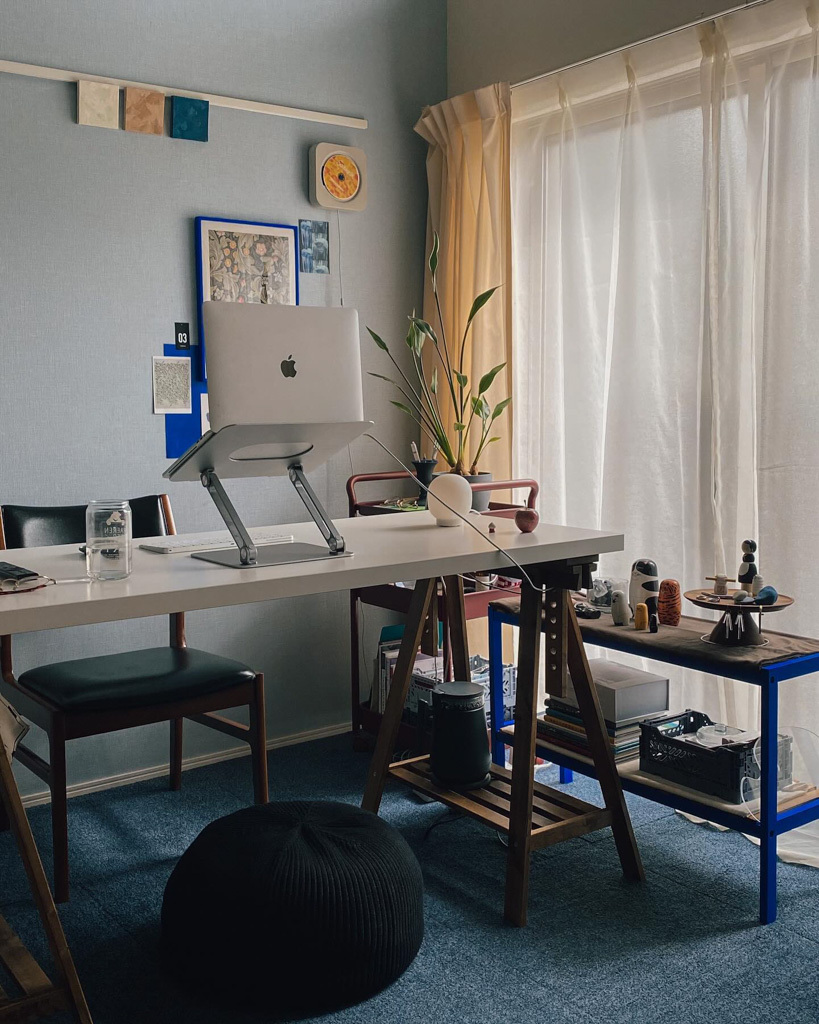 お部屋のコンセプトは「仕事も趣味も楽しむ部屋」。居心地の良さと仕事のしやすさのバランスを楽しみたいから、模様替えも定期的に行っているのだそう。棚は自分で鮮やかなブルーにペイント。無印良品のえんじ色のワゴンとの相性もばっちり!