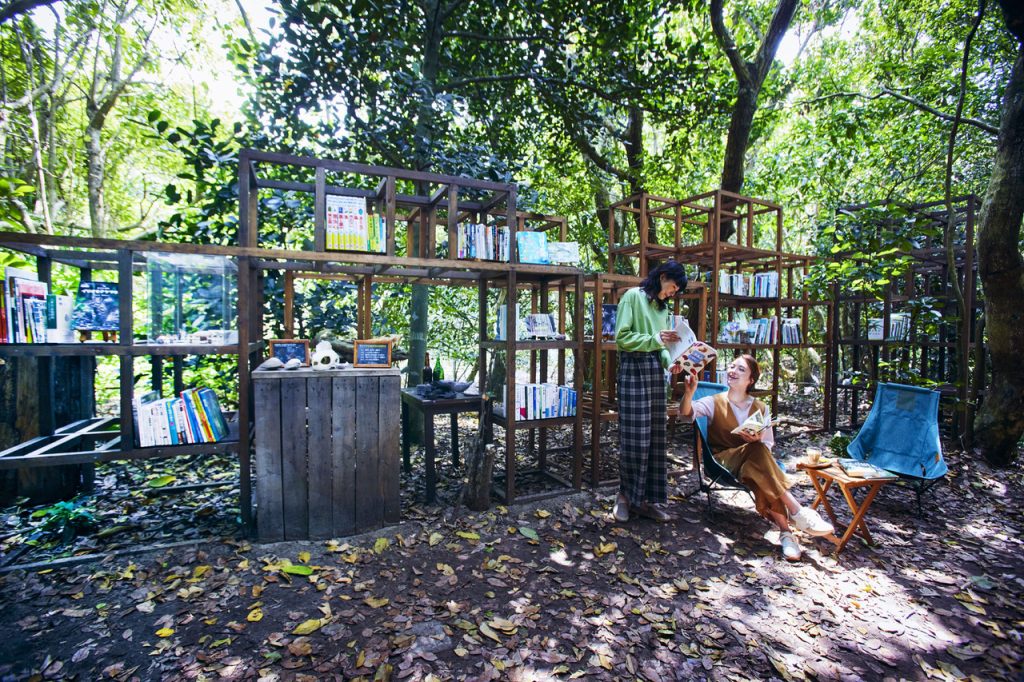 「イリオモテジャングル図書館」は、星野リゾート 西表島ホテル敷地内のジャングルエリアにあります。図書館は本来、本を読む場所ですが、ここでは読んで終わりではありません。図鑑に載っている生き物や植物がすぐそばにいるため、本を読みながら本物に出会うことができます。また、ジャングルの中にあるため、気になる植物の近くや木陰など、好きな場所で本を読むことができるのも魅力です。