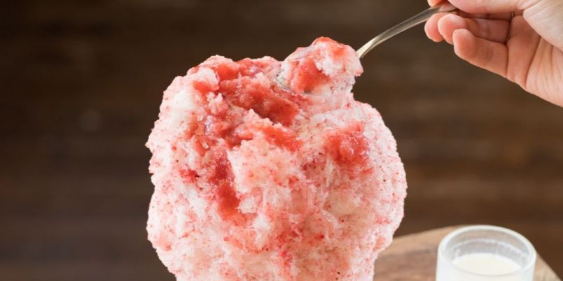 かき氷が崩れないように上手に食べるポイントは、真ん中に穴を開けて中に落とし込むように食べること。お店の方が、食べ方のコツを教えてくれました。