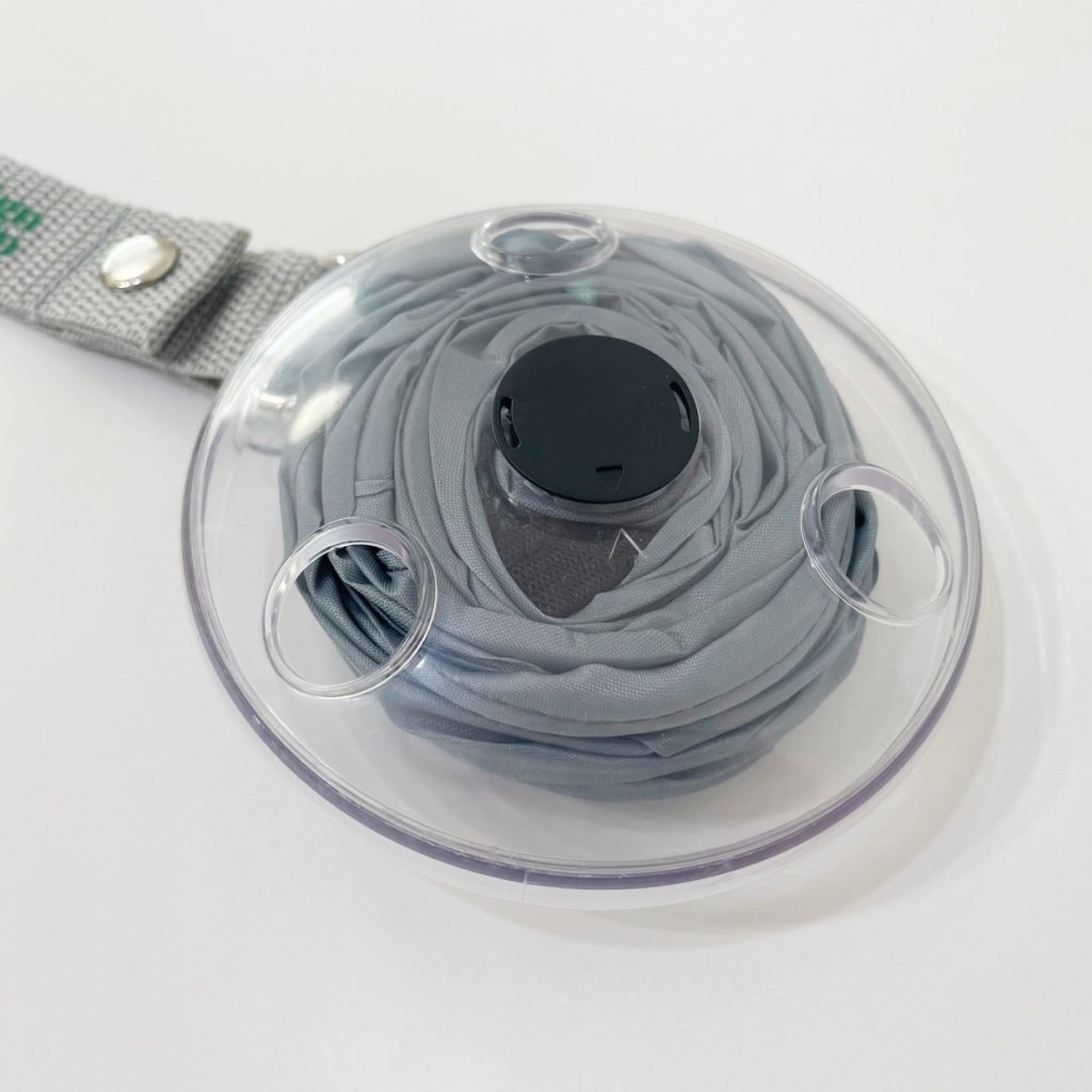 透明ケースの中にエコバッグが収納されており、円盤のようなユニークなデザインが特徴的です。