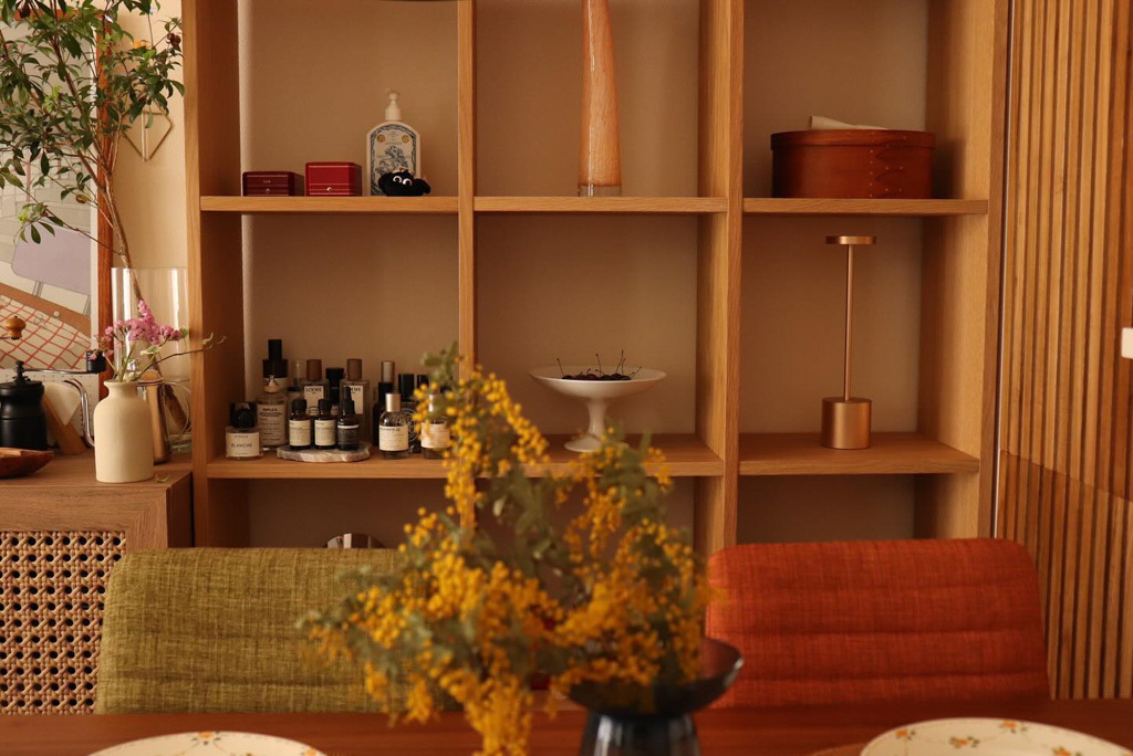 棚の上には二人の思い出の品がお部屋の雰囲気に馴染むように、ディスプレイされています。