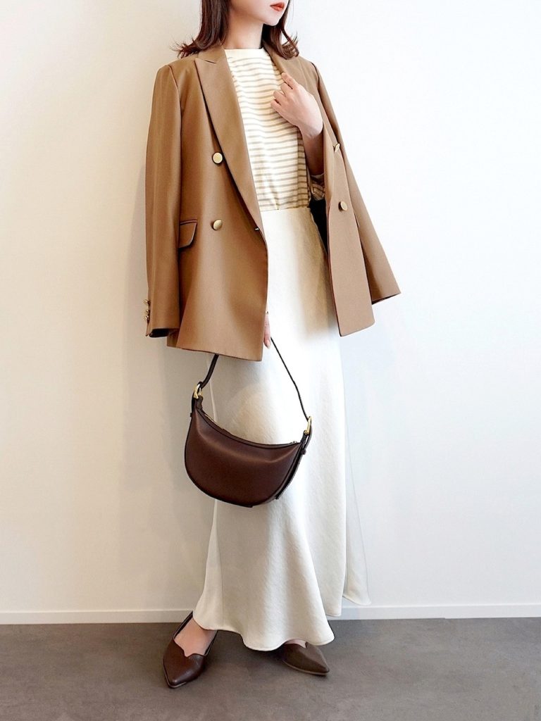 きれいめ派さんにおすすめのボーダーコーデ。ジャケットとボーダーTをベージュでリンクさせて柔らかさのある女性らしいスタイルに。深みのあるチョコレートブラウンを添えればトレンド感もプラスでき、印象も引き締められます。