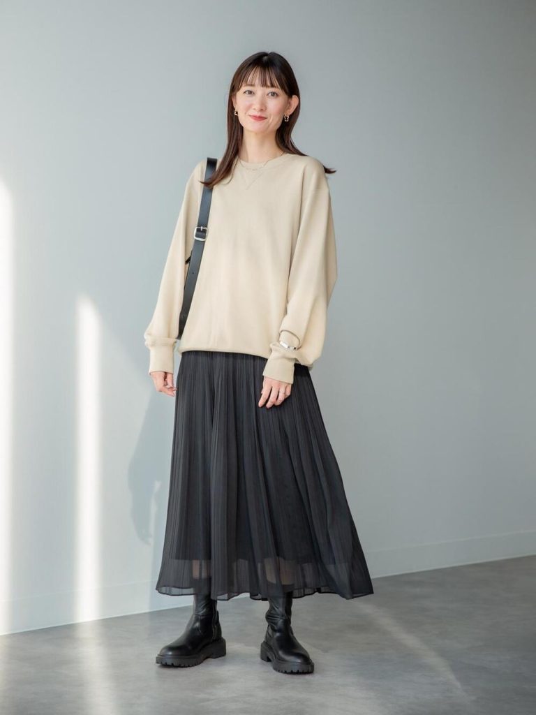 男女兼用のスウェットシャツは、ウィメンズよりも身丈や裄丈が長く、縦長なシルエットを作ります。柔らかい色味のベージュスウェットには黒スカートを合わせて、きれいめな大人カジュアルスタイルに。