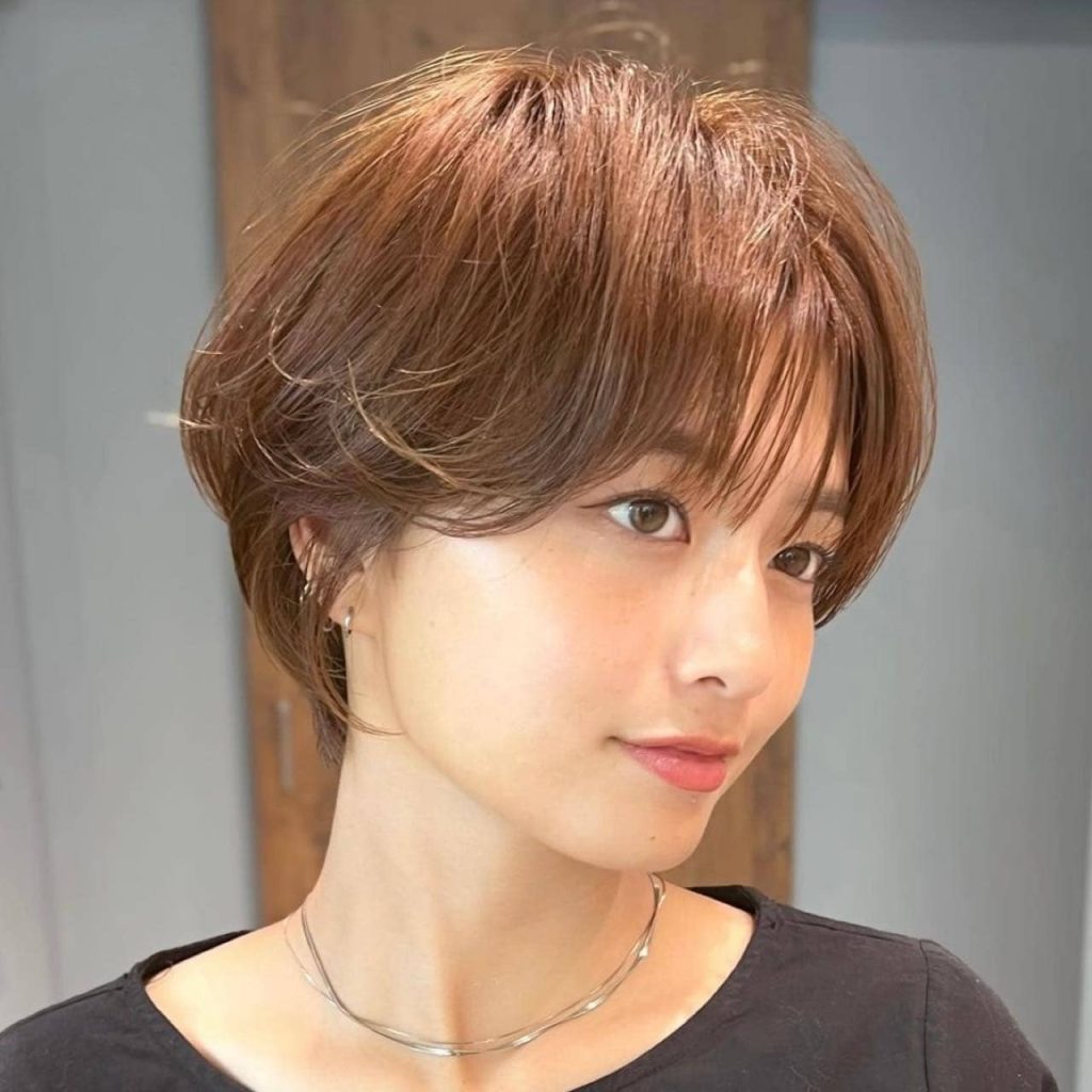 若見え効果を抜群に期待できるのが、顔周りにレイヤーを入れたコンパクトなシルエットのショートヘア。骨格や輪郭をさり気なく補正でき、似合わせも簡単です。