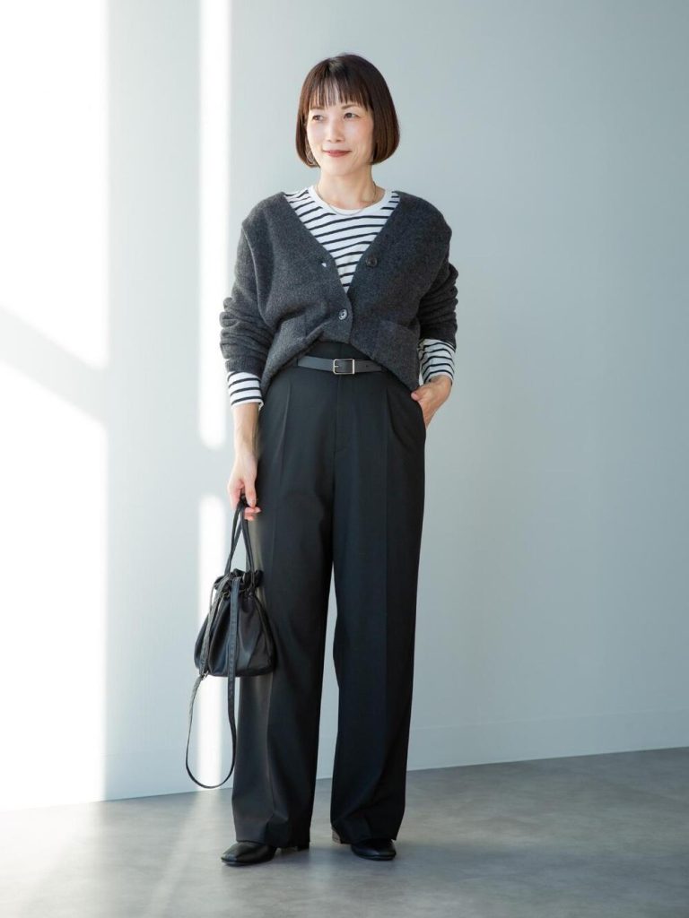 スフレヤーンのカーディガンには、パキッとした柄が目を惹くボーダーもあります。オフホワイトのカーデには、ブラックのアイテムを合わせて、大人っぽい秋のモノトーンコーデの完成。