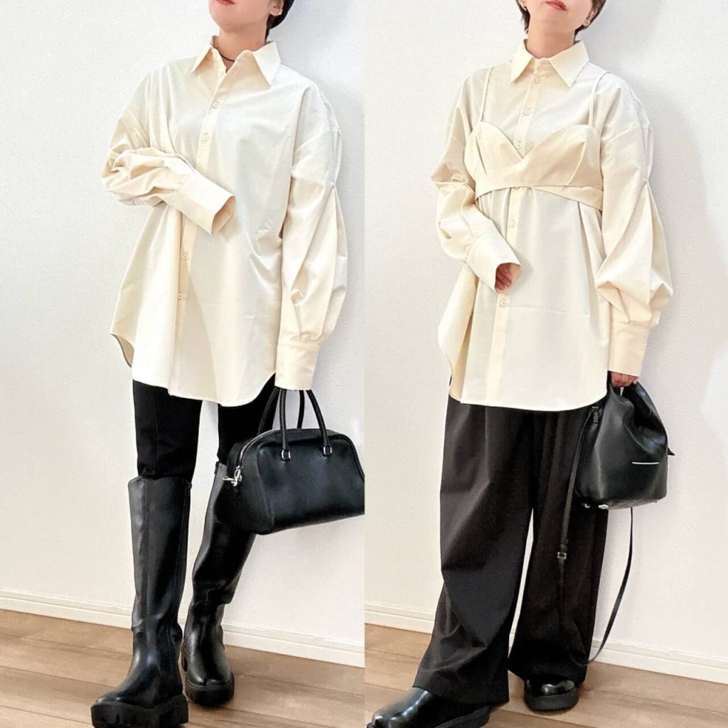 大きめなサイズ感のシャツですが、付属のビスチェが胸元でキュッと引き締めて目線を上げてくれるので、ルーズながらも女性らしいシルエットで着こなせます。