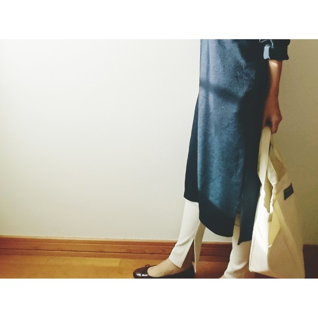 こちらは、木曜日に使用したワッフルTを使用した、また別の印象が楽しめる着こなし。休日にぴったりな、楽ちんだけと女性らしい合わせ方です。