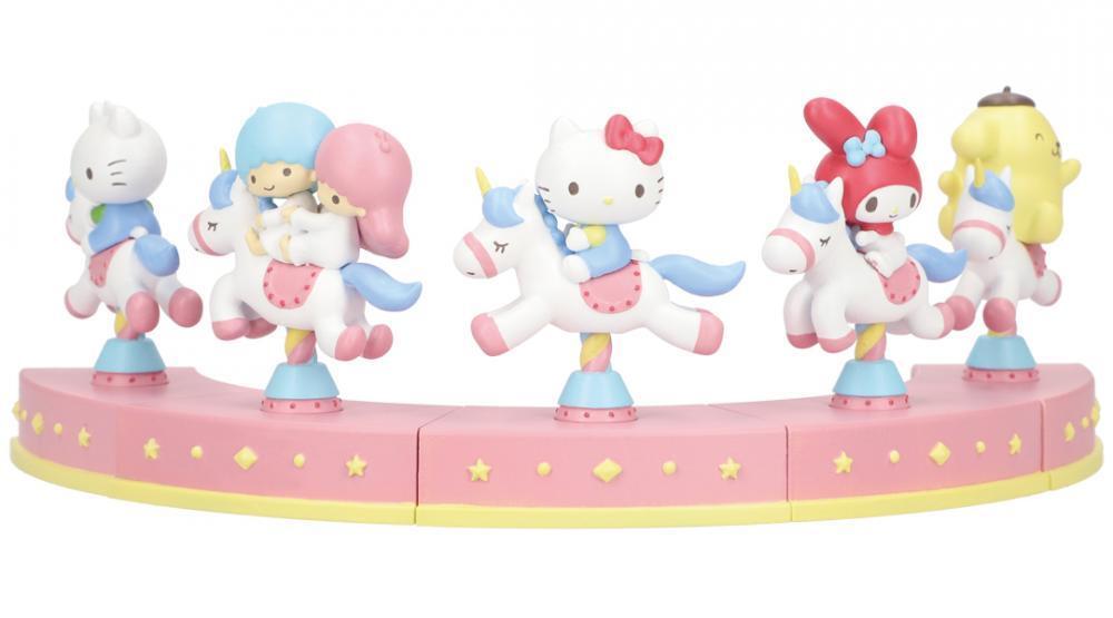 メリーゴーランドの木馬に乗ってゆれるサンリオキャラクターたちの姿がかわいらしいバブルヘッドドールのグッズです。