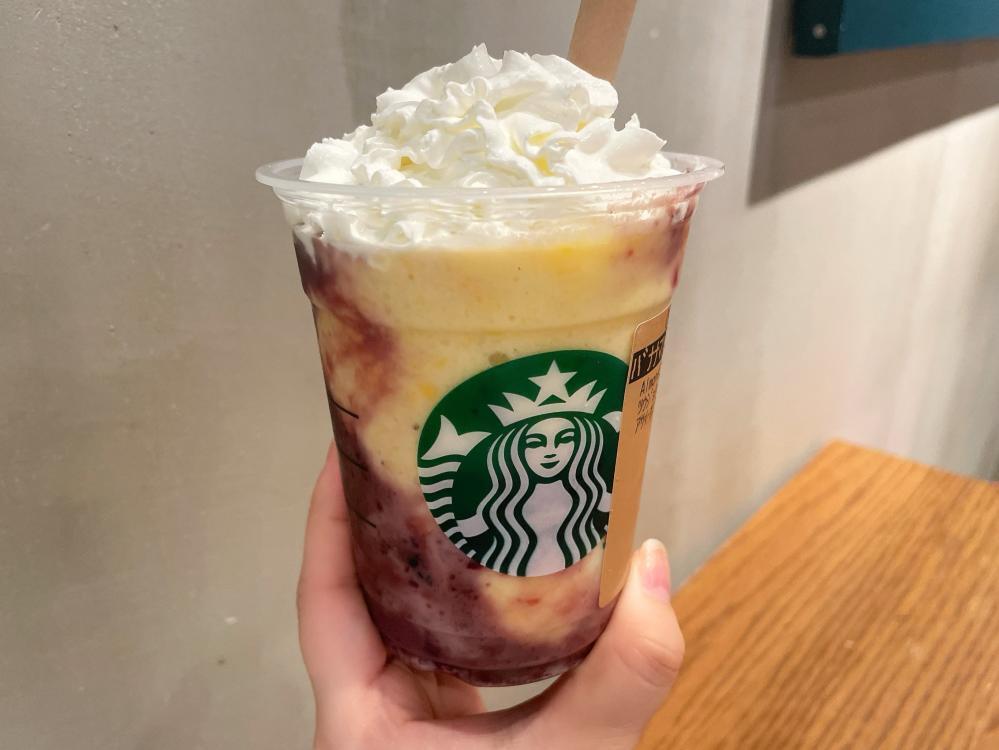 そこに、バナナ、マンゴー、ブルーベリーが合わさると、口の中はパラダイス……! 全てのフルーツが果肉感を残したままゴロゴロと入っています。スターバックスコーヒーで登場したフラペチーノでも、ここまでフルーティーな商品はレアかもしれません。ミルクやクリームが入っているのに、それを上回る爽やかさ……。