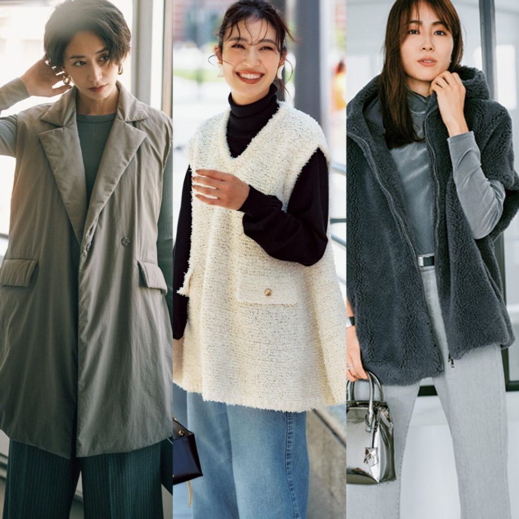 きれいめアイテムのジレは カジュアル素材で取り入れるのが旬。 大人ベージュがグレーコーデにマッチ