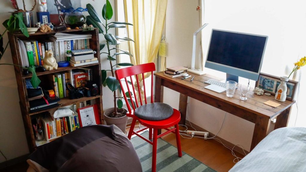 お部屋の真ん中は、無印良品のクッションソファを置いたリラックススペースと、ワークスペース。テーブルはCreemaでサイズオーダーしたもの。大きさや高さがぴったりでとてもお気に入りなのだそう。食事をするときもこちらを使います。チェアはIKEAのもので、部屋の中に「赤」のアクセントを取り入れたくて選ばれたそう。