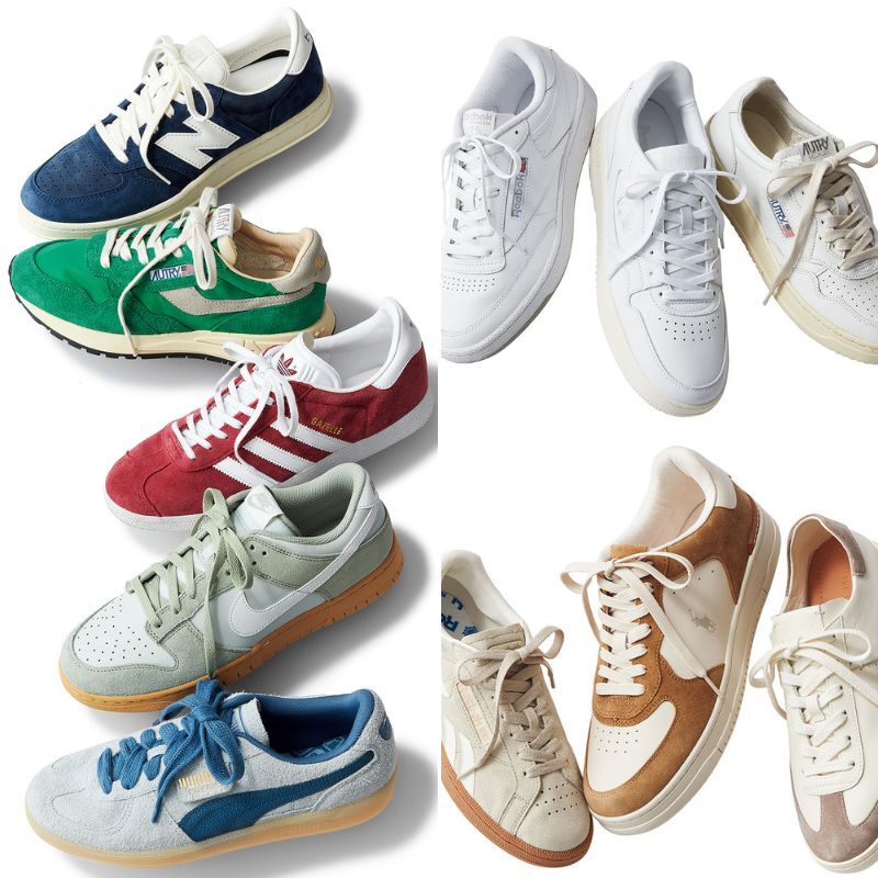 テニスやバスケットボールなど、コートでプレーするスポーツのスニーカー=コートシューズ。シンプルレトロな見た目はどんな服にもマッチ、コーデのさりげないアクセントに最適!