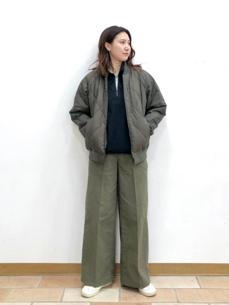 ホワイトマウンテニアリングとのコラボアウター。リサイクルダウンとシート状中綿のハイブリッドで、耐久撥水、3Dカットで腕が動かしやすいなど機能性が高いです。上下オリーブでそろえたコーデは、軽やかにこなれ感アップ。