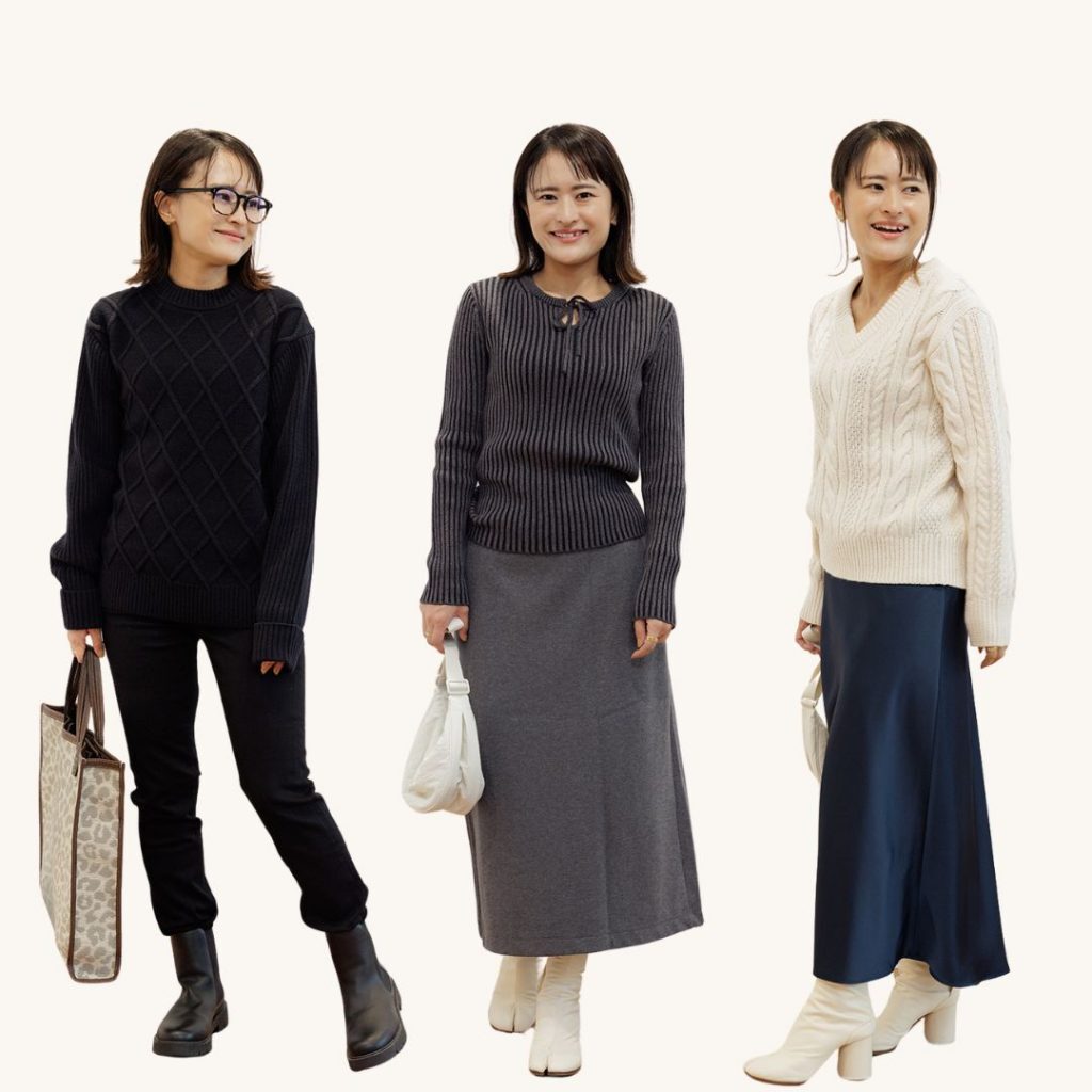 「身頃と袖で編み地を変えたメンズのセーターは、シンプルコーデにも表情が生まれるダイヤ柄なのでオールブラックも洒落感のある着こなしに。袖が元々折られたデザイン、かつ着丈が少し短めになっているから、女性もスッキリ着やすいデザインです」