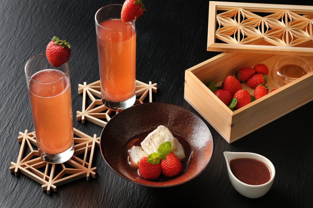 旬の食材を活かした会席料理の乾杯酒には、「いちごのカクテル」をご用意。「とちおとめ」のピューレと、栃木の地酒「とちあかね」を使用したカクテルです。「とちあかね」はいちごの花から分離された「いちご酵母」を使用して醸し、いちごを思わせる赤色の日本酒です。界 鬼怒川のオリジナルカクテルで、大切な方と過ごす夜の特別なひとときが始まります…♡