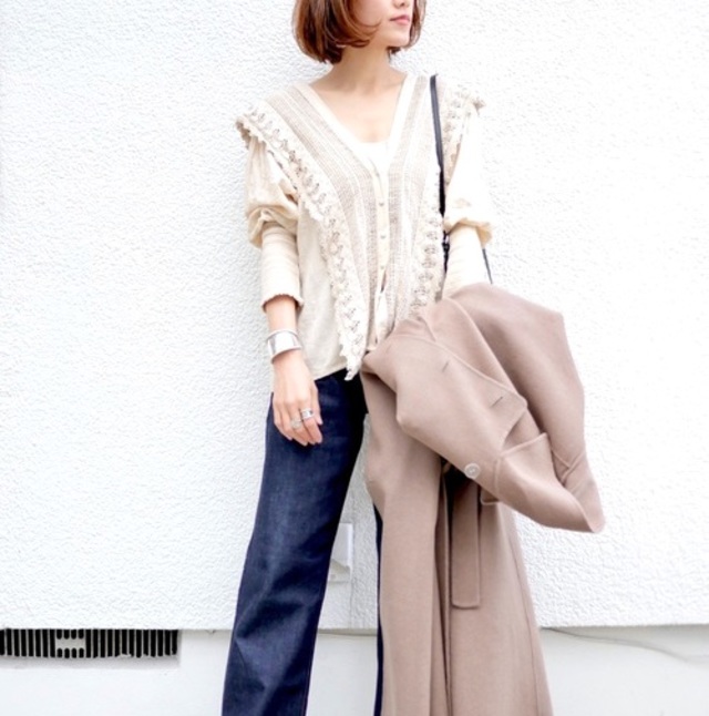 さらに付属のベルトをつけた、トレンチコートのようなスタイリングもオシャレです。ゆったりとしたドロップショルダーや、袖口のタックが柔らかい雰囲気も演出。テイストを選ばないので、ヘビロテ確実なコートです。