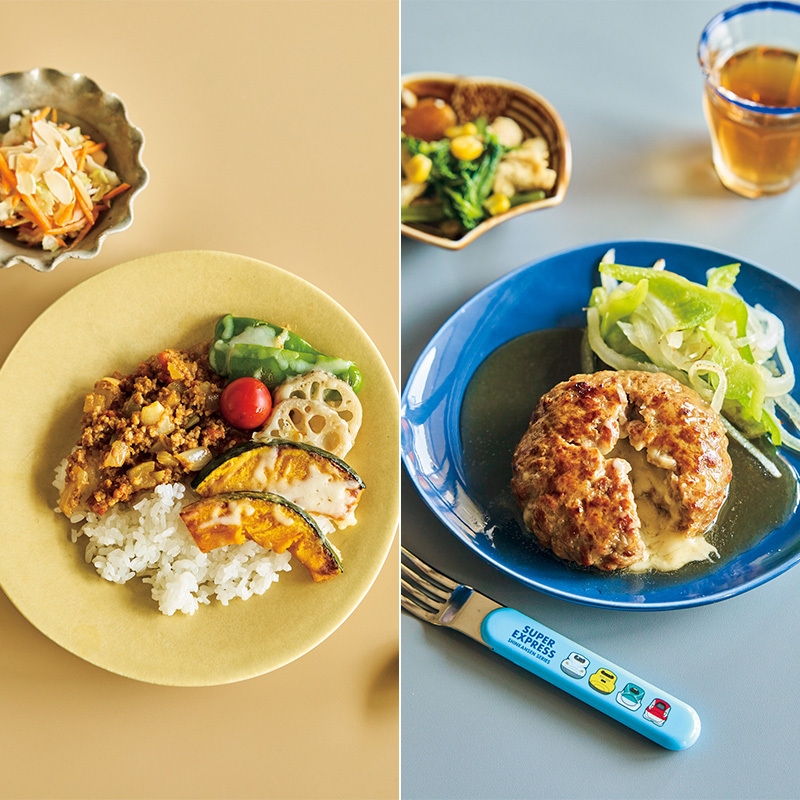 ハンバーグにお箸を入れるとシズル感たっぷりにチーズがあふれ、撮影現場は大盛り上がり。子どもも喜んでくれるはず。副菜との味のバランスも◎。(藤井)