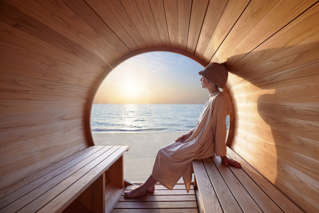 リゾナーレ小浜島のバレルサウナは、海側に大きな窓を配した造りが特徴です。刻々と昇る朝日と移り変わる空の表情を眺めながら、贅沢にサウナを満喫できます。