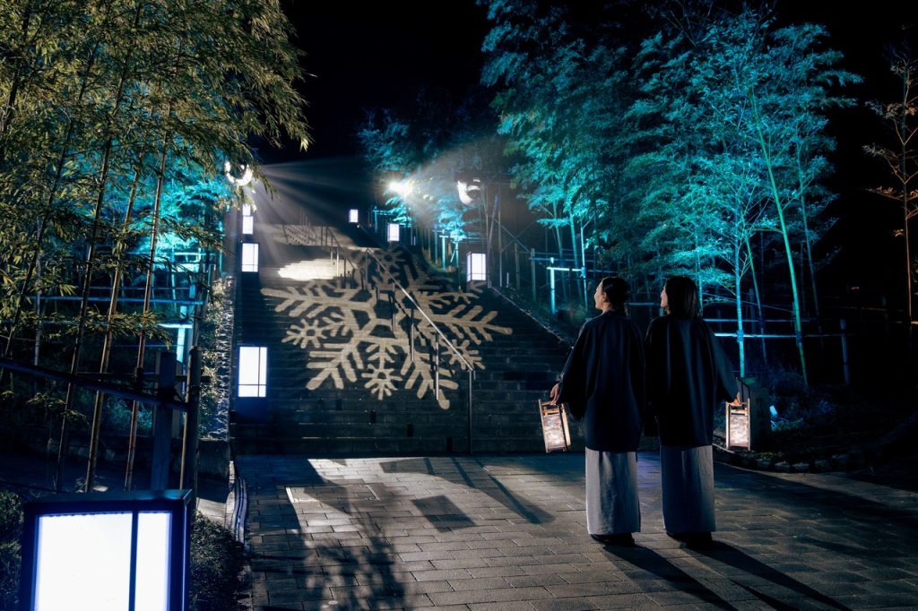 イベント期間中にしか見ることのできない、温泉街のイルミネーションとオリジナルの行燈で、冬のそぞろ歩きが楽しめます。さらに、16番目の詩をイメージして彩った界 長門のトラベルライブラリーでこの滞在に思いをはせるひとときを過ごしてほしいと思い、「墨で彩る行燈そぞろ歩き」を企画しました。