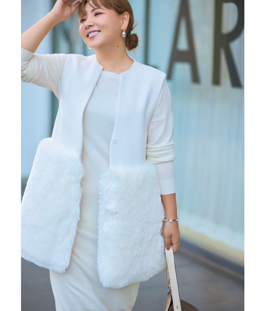 ジレを軸に品格ファッションの代名詞〝オールホワイト”に挑戦。ジレ¥26,400(CELFORD)ワンピース¥110,000(エクストリーム カシミア/ガリャルダガランテ 青山店)バッグ¥39,600(LORISTELLA/DES PRÉS)ピアス¥36,520(バルブス/ZUTTOHOLIC)バングル¥28,600(ワンエーアールバイウノアエレ/ウノアエレ ジャパン)