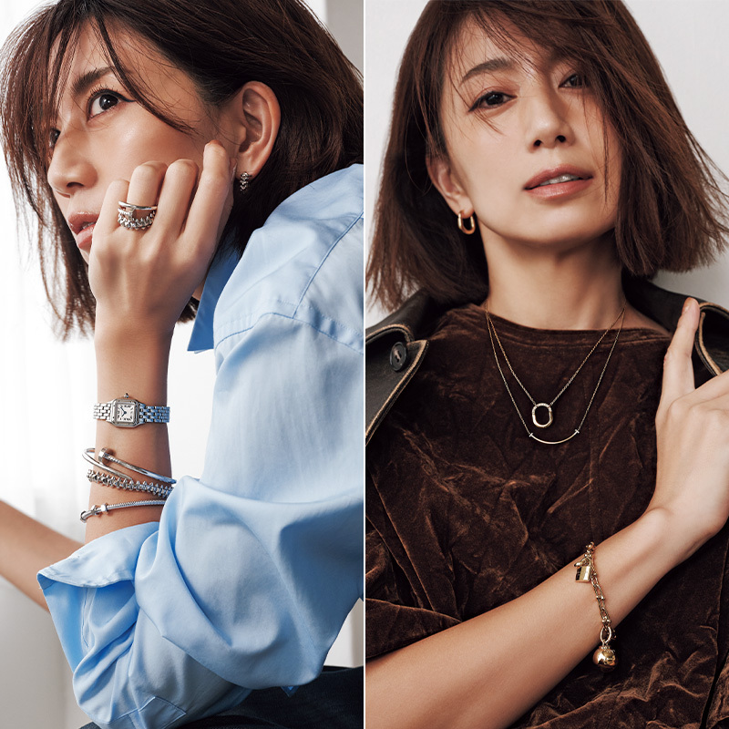イヤリング「クラッシュ ドゥ カルティエ」[K18WG]¥660,000リング[指先側]「ジュスト アン クル」[K18WG]¥451,000[付け根側]「クラッシュ ドゥ カルティエ」[K18WG]¥423,500 時計「パンテール ドゥ カルティエ」[スティール]¥577,500 ブレスレット[手首側から順に]「ジュスト アン クル」[K18WG]¥1,346,400「クラッシュ ドゥ カルティエ」[K18WG]¥1,557,600「エクル ドゥ カルティエ」[K18WG]¥1,306,800(すべてカルティエ/カルティエ カスタマー サービスセンター)シャツ¥22,000(エディション/エディション 表参道ヒルズ店)パンツ¥29,700(アストラット/アストラット 新宿店)
